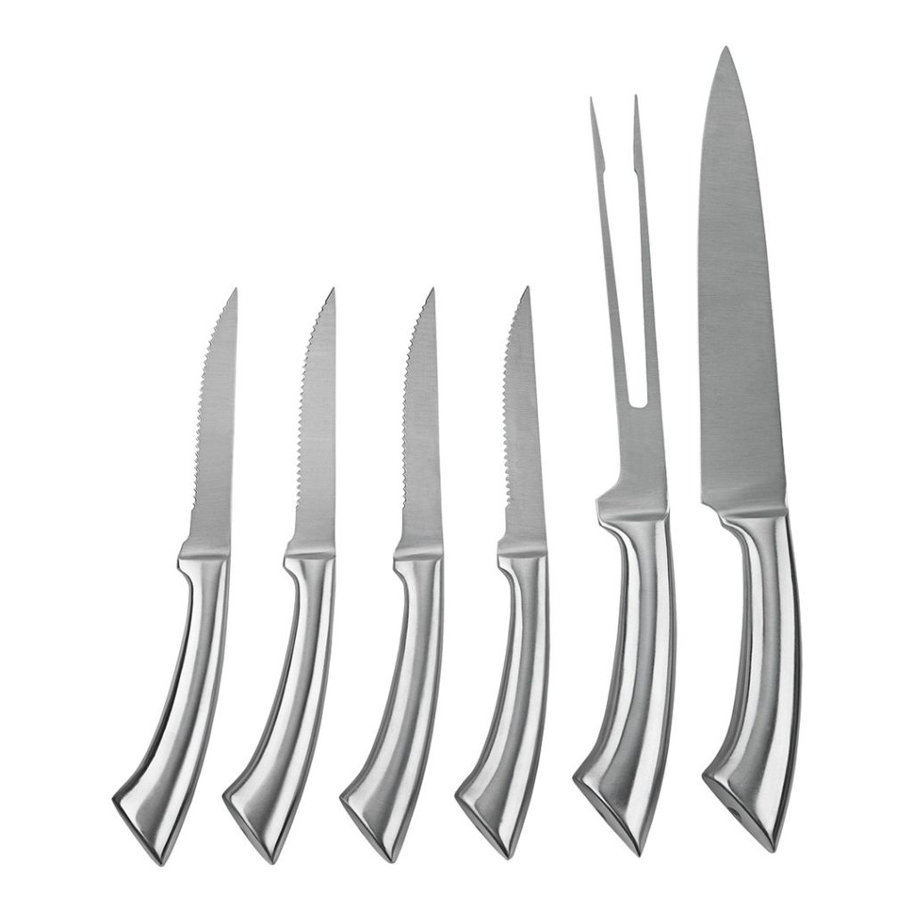 Hergestellt aus hochwertigstem Edelstahl, besteht dieses Set aus vier Steakmessern und einem zweiteiligen Tranchier-Set.