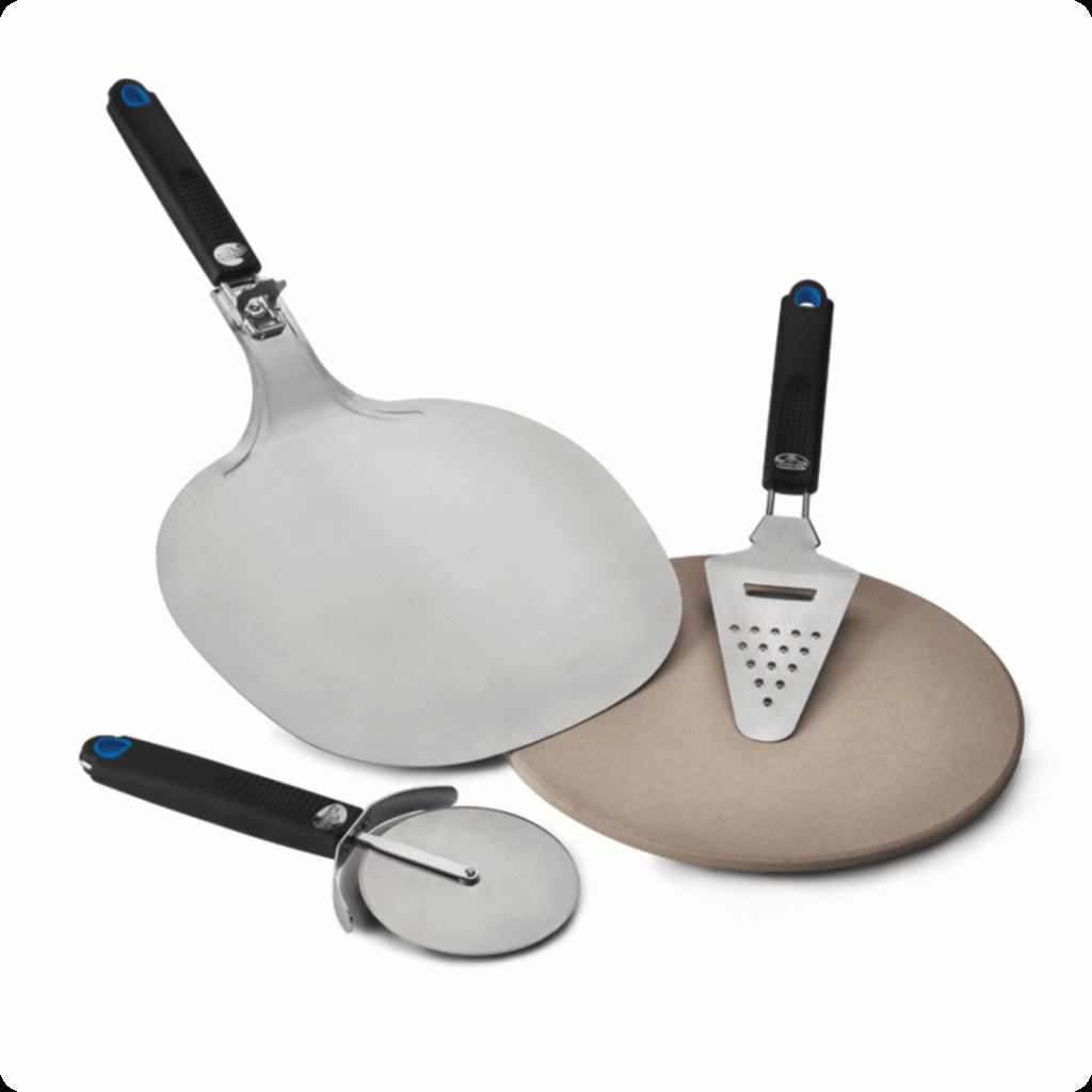 Das Set besteht aus einem Pizzastein, einem Pizza-Heber mit klappbarem Griff, einem extragroßen Pizza-Schneider sowie einer Käse-Raspel.