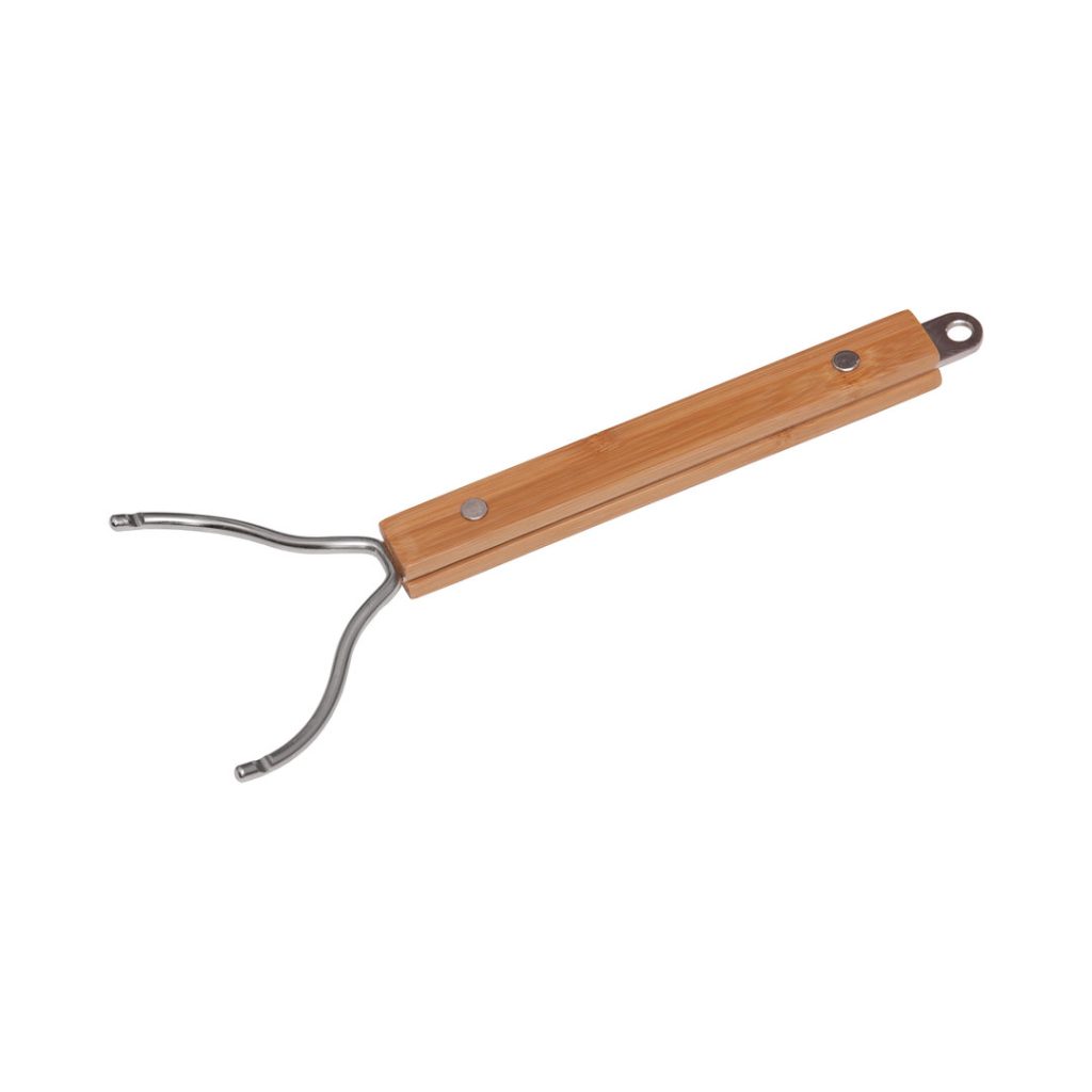 Robuster Grillrostheber aus rostfreiem Edelstahl mit Bambusgriff zum sicheren und einfachen Anheben und Entnehmen des Grillrostes.