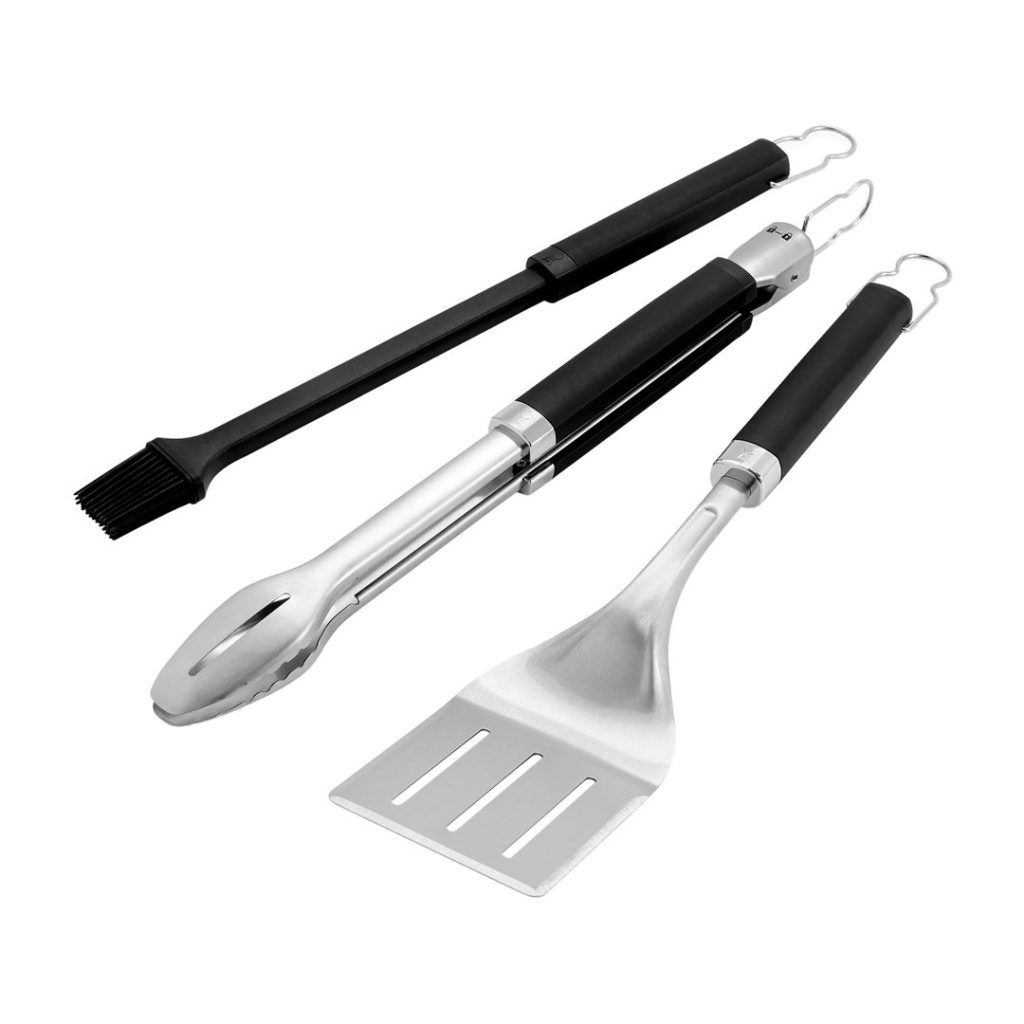 Das praktische Grillbesteck-Set, bestehend aus Weber Precision Grillzange, -wender und -pinsel.
